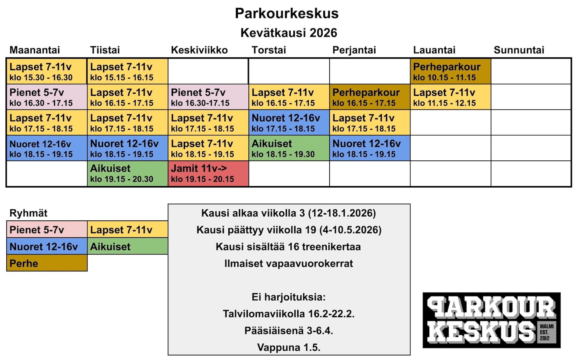 Ilmoittautuminen tehdään normaalisti verkkosivujen kautta. Ilmoittautumisen yhteydessä kommenttikenttään voi merkitä, että kyseessä on kokeilukerta. Maksuvaiheessa valitaan ennakkolasku, jolloin kauden maksu suoritetaan vasta kokeilutunnin jälkeen, jos päätät jatkaa kaudella. Ilmoittautumisen peruminen tehdään kokeilukerran jälkeen sähköpostitse tai soittamalla.
