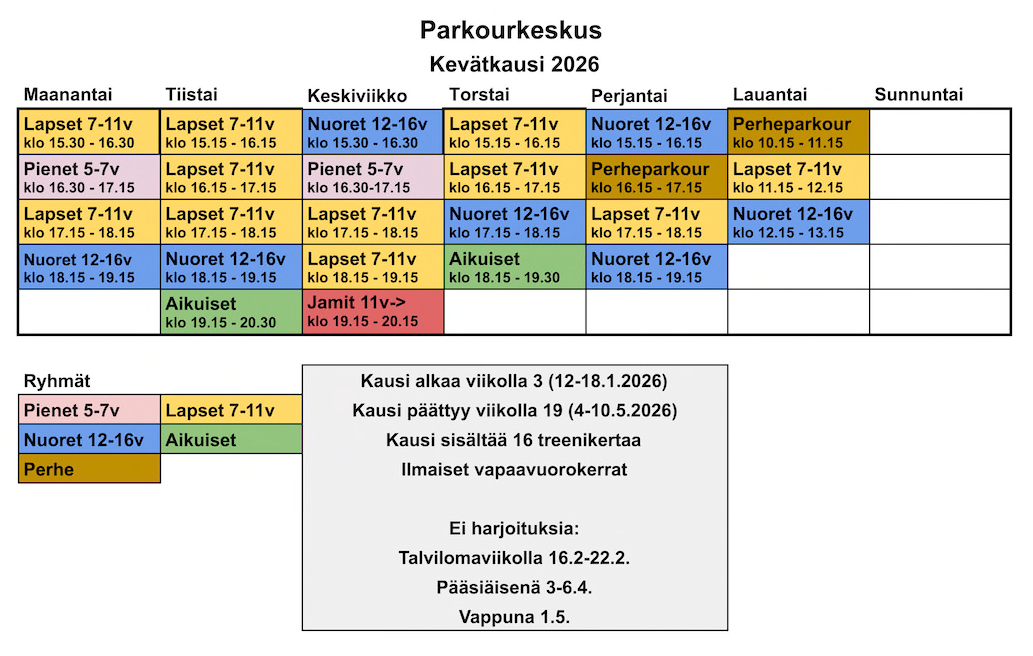 - Parkour Kevätkausi kestää 16 viikkoa. Kausi alkaa viikolla 3 (12-18.1.) ja päättyy viikolla 19 (4-10.5.)